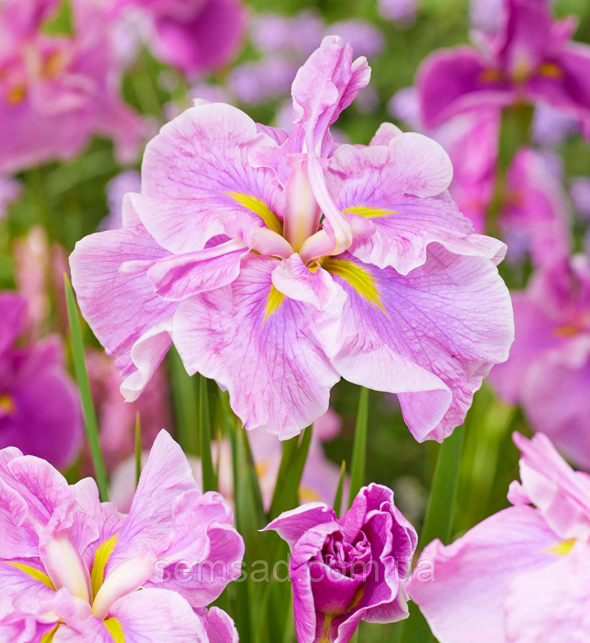 Ірис мечовидний – прийшло до нас із японії. Багаторічна короткокореневищна рослина. Листя мечоподібне, зазвичай коротше квітконосів (не більше 50 см), світло-зелене, з виступаючою блискучою середньою жилкою. До осені набувають бронзового забарвлення. Цвіте у першій половині липня. Висота під час цвітіння 65-70 см. Квітки діаметром до 30 см.